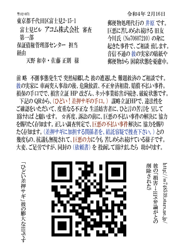 車両突入事故の後、危険放置、不正弁済相殺、賠償不払い事件。損保の手口でで、損害立証 HP 改ざん、ネット事業妨害が続き、破綻状態です。 下記の QRから、(ひどい!差押サギの手口。) 謀略立証HPで、違法性を ご確認をいただいて、度重なる不正な 生活妨害者に、ひと言の苦言を 呈して頂ければ と願います。 ☆再度、訴訟の前に、巨悪の不払い事件の解決に