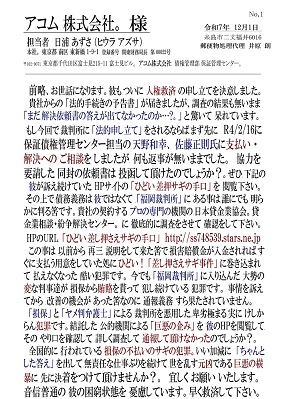 何も返事が無いままでした。 協力を要請した 同封の依頼書は 投函して頂けたのでしょうか?。ぜひ、下記の 彼が訴え続けていた HPサイトの 「ひどい、差押サギの手口」 を 閲覧下さい。