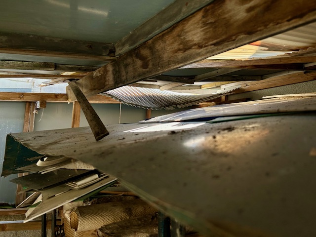 子供とはいえ、上に登って飛び回わられると、ひとたまりも無い作りで、恐らくその時に、雨もりの第二原因となる、ゆがみとズレ、隙間や、ヒビが入ってしまったものと、推察されます。今、 ふいに、過去の記憶が甦り、色んな原因が重なり、起きてきた可能性が浮かんできました。