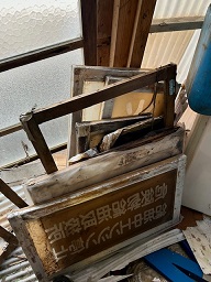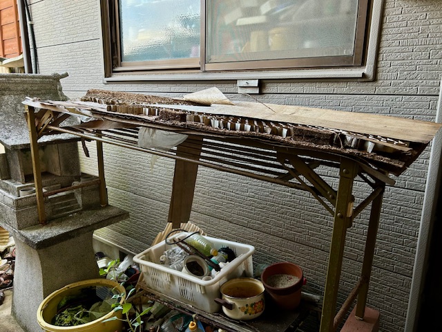 報告の続きを伝えます。得意先のシルクスクリーンの版の型枠が、雨水で損壊し、印刷に使う道具類が、長年の湿気により、全て錆びつき、壊れて破損していました。