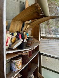 屋根の損壊によって起こる、雨水による小屋の中の漏水、湿気、カビ、腐敗、錆びつき、など看板製作の道具や、保存していた仕事の原稿図案など、全ての貴重な資材などが失われた被害の実録。 第一、第二